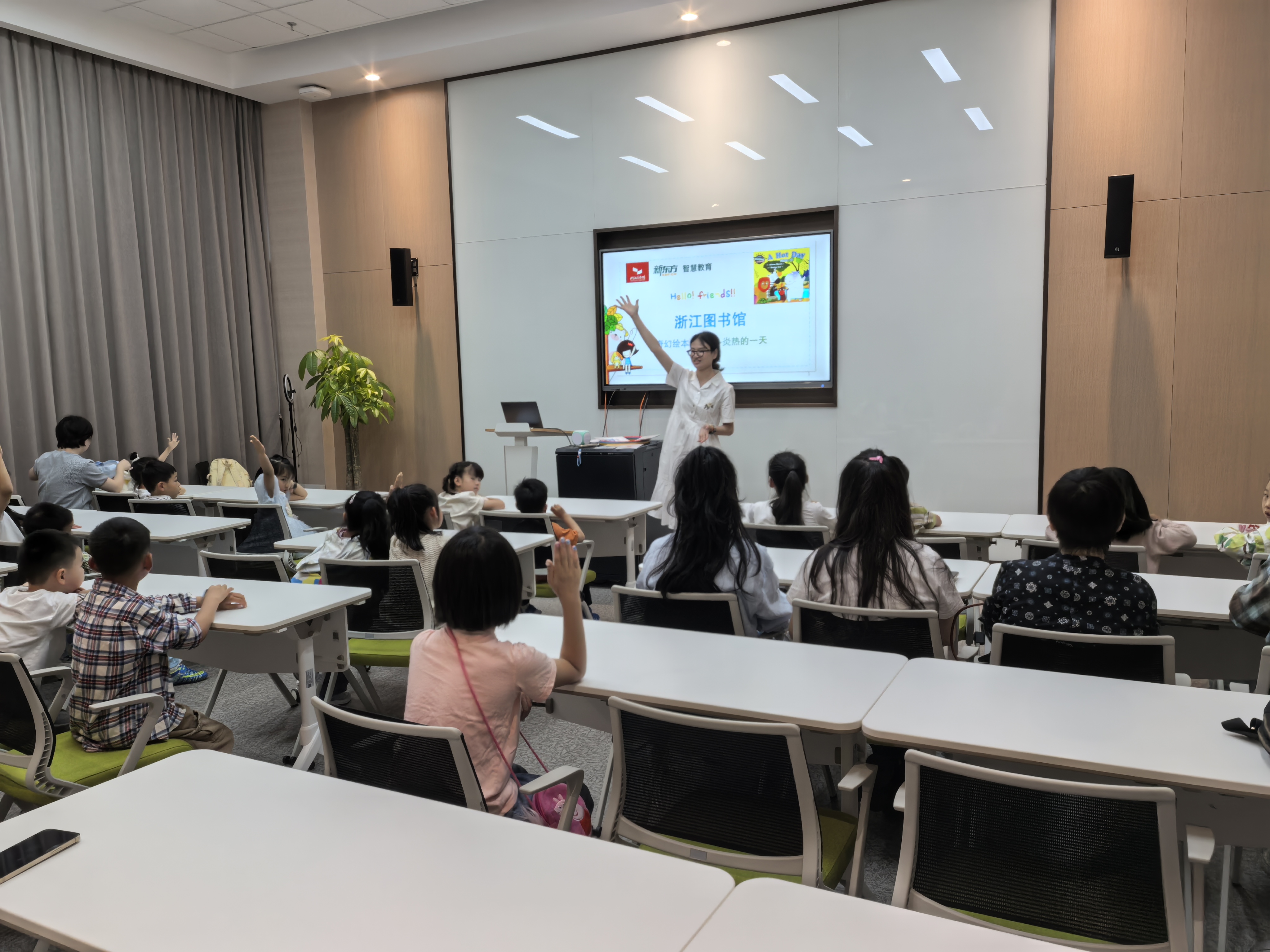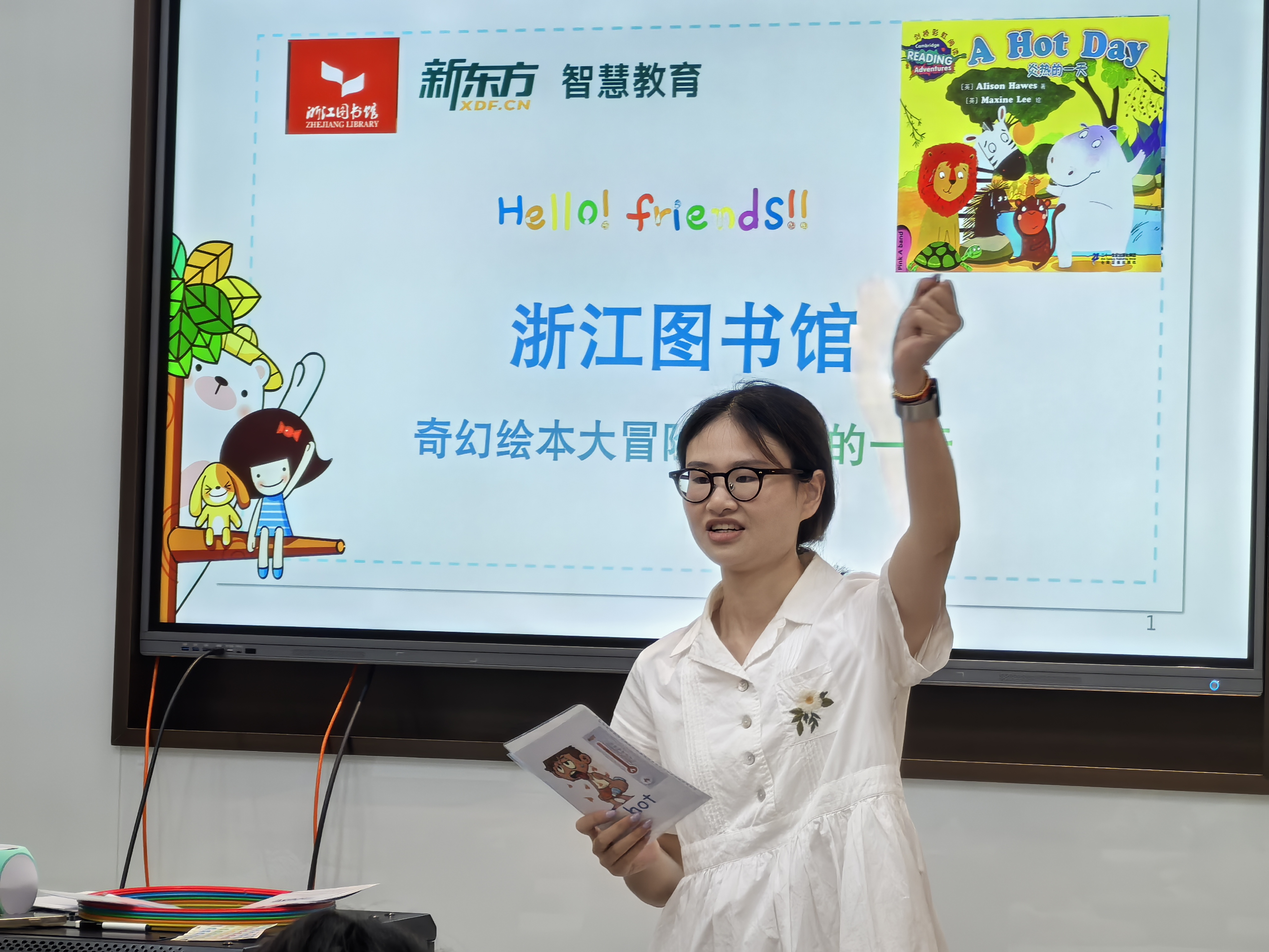 2025年6月1日下午,适逢儿童节,浙江图书馆联合新东方智慧教育为前来参与活动的小读者和家长,带来了一场双语绘本的阅读盛宴,40余位参与者在交流空间(二)共同品读《A Hot Day(炎热的一天)》这一英语启蒙绘本。