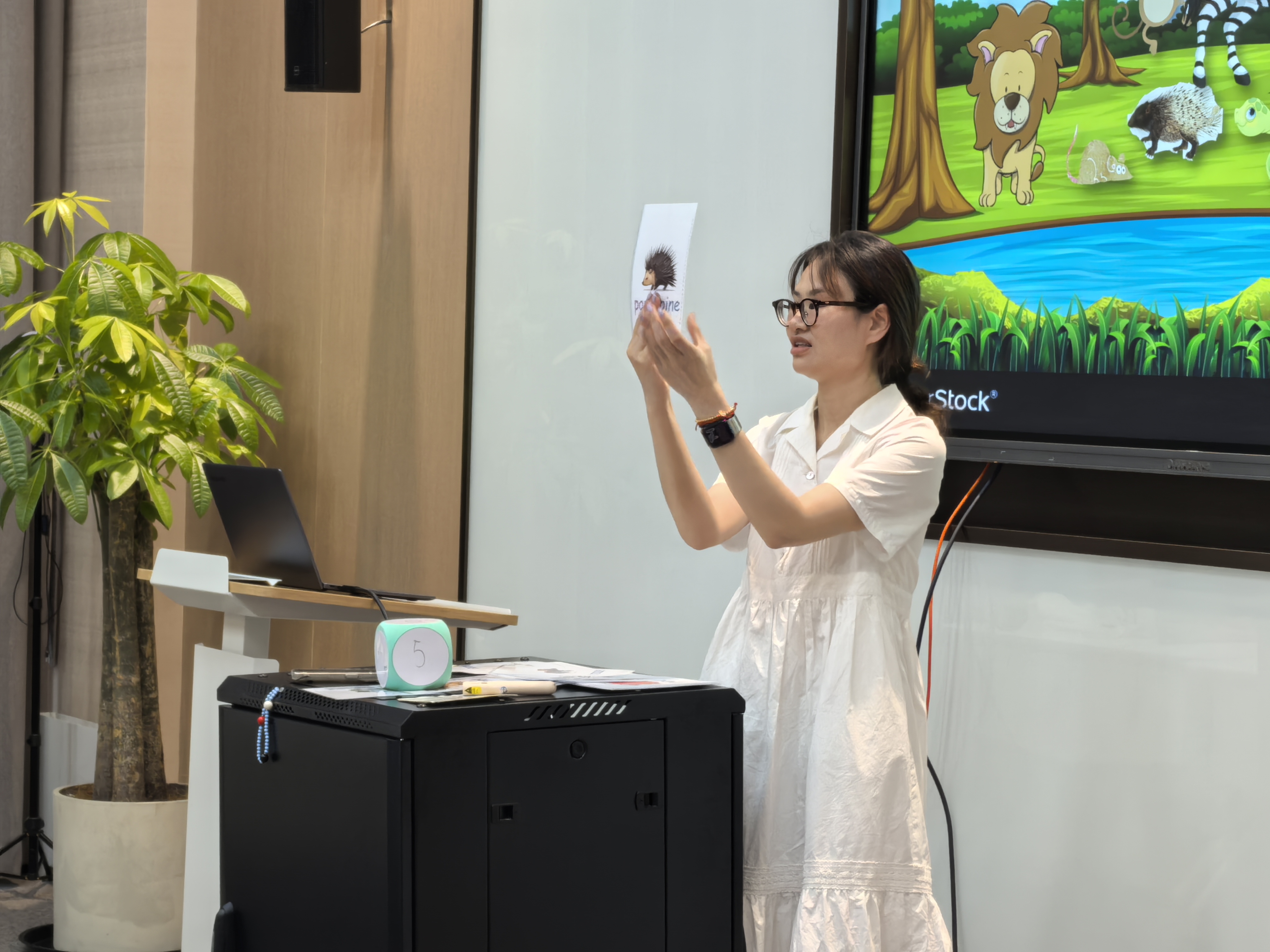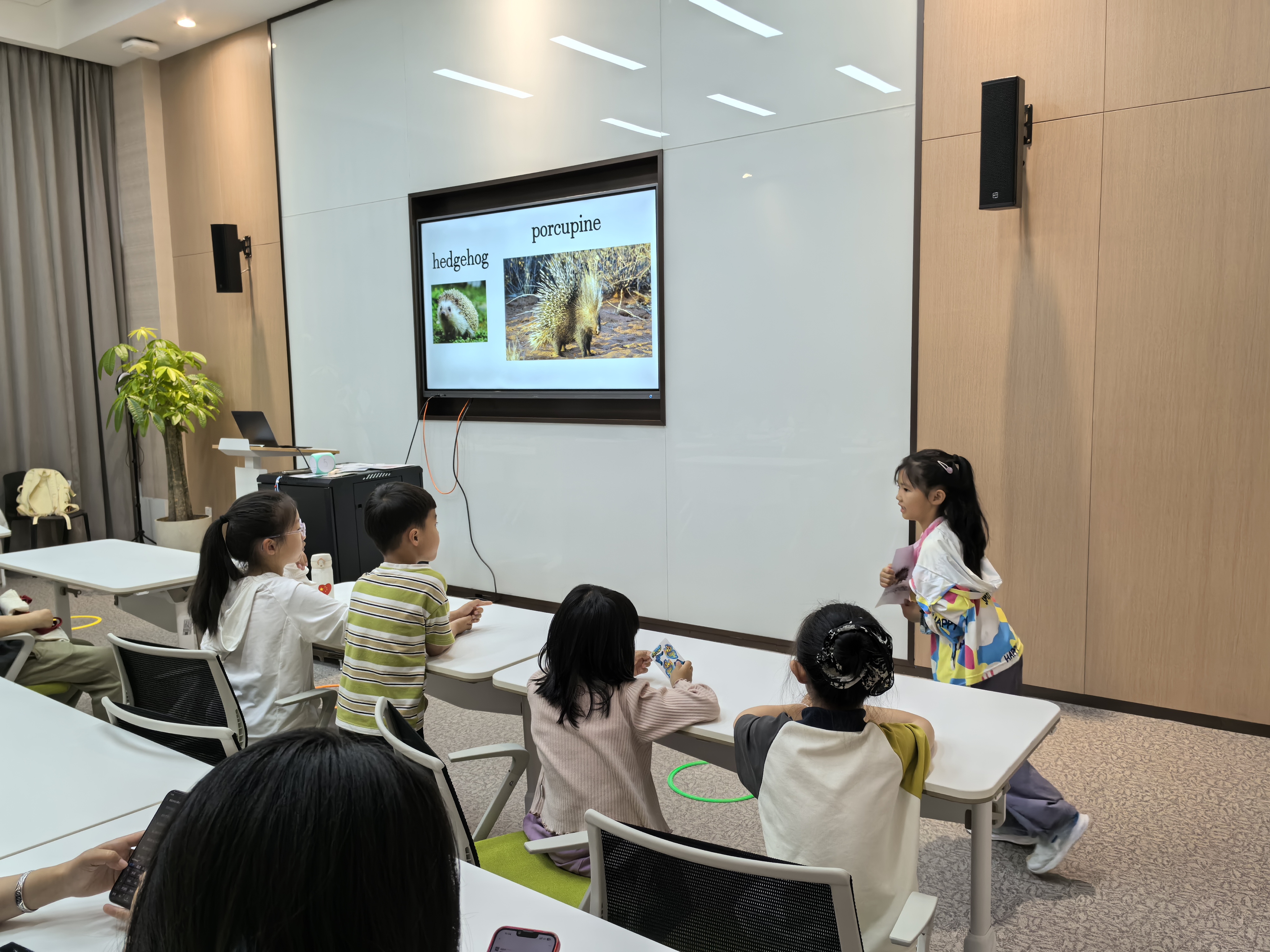在完成大脑热身后,老师抛出本次的重难点词汇“porcupine(豪猪)”,并与其外形相似的“hedgehog(刺猬)”进行对比,进一步了解豪猪的特点。在阅读绘本的过程当中,加入其他常见动物英文的巩固,沿着绘本的故事思路,对比这些动物的体型大小,通过音量表现不同动物入水的声音,让绘本的场景更加生动地呈现在小读者们的眼前。