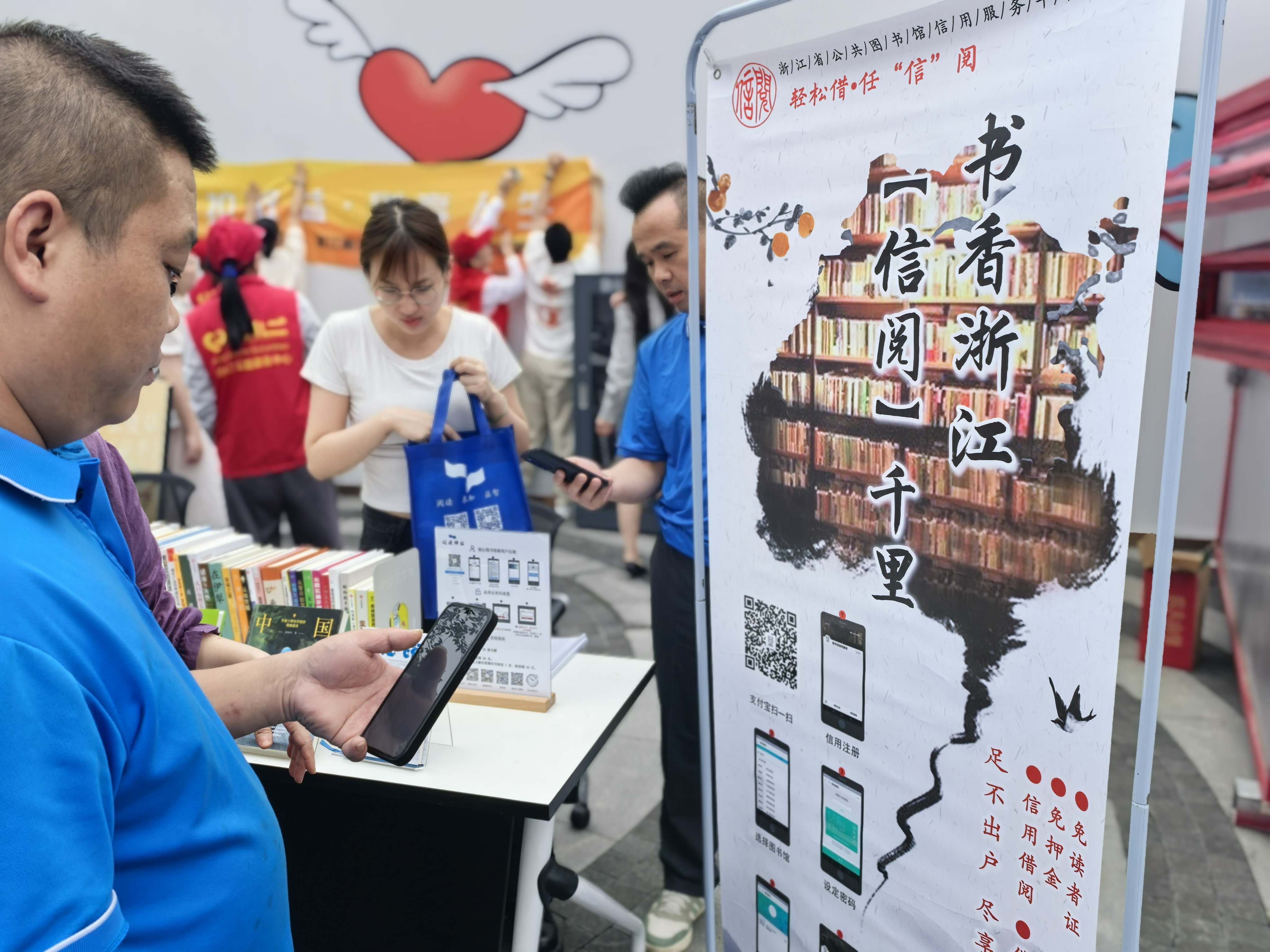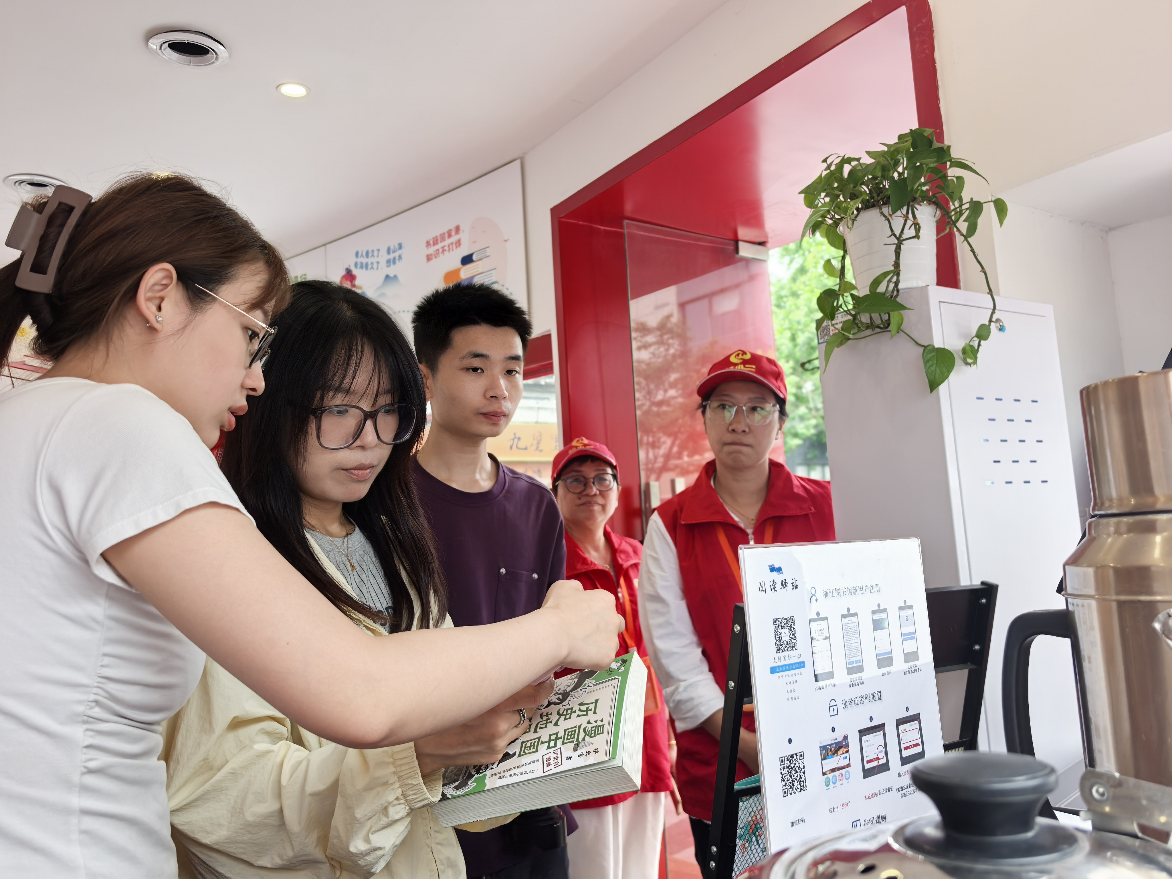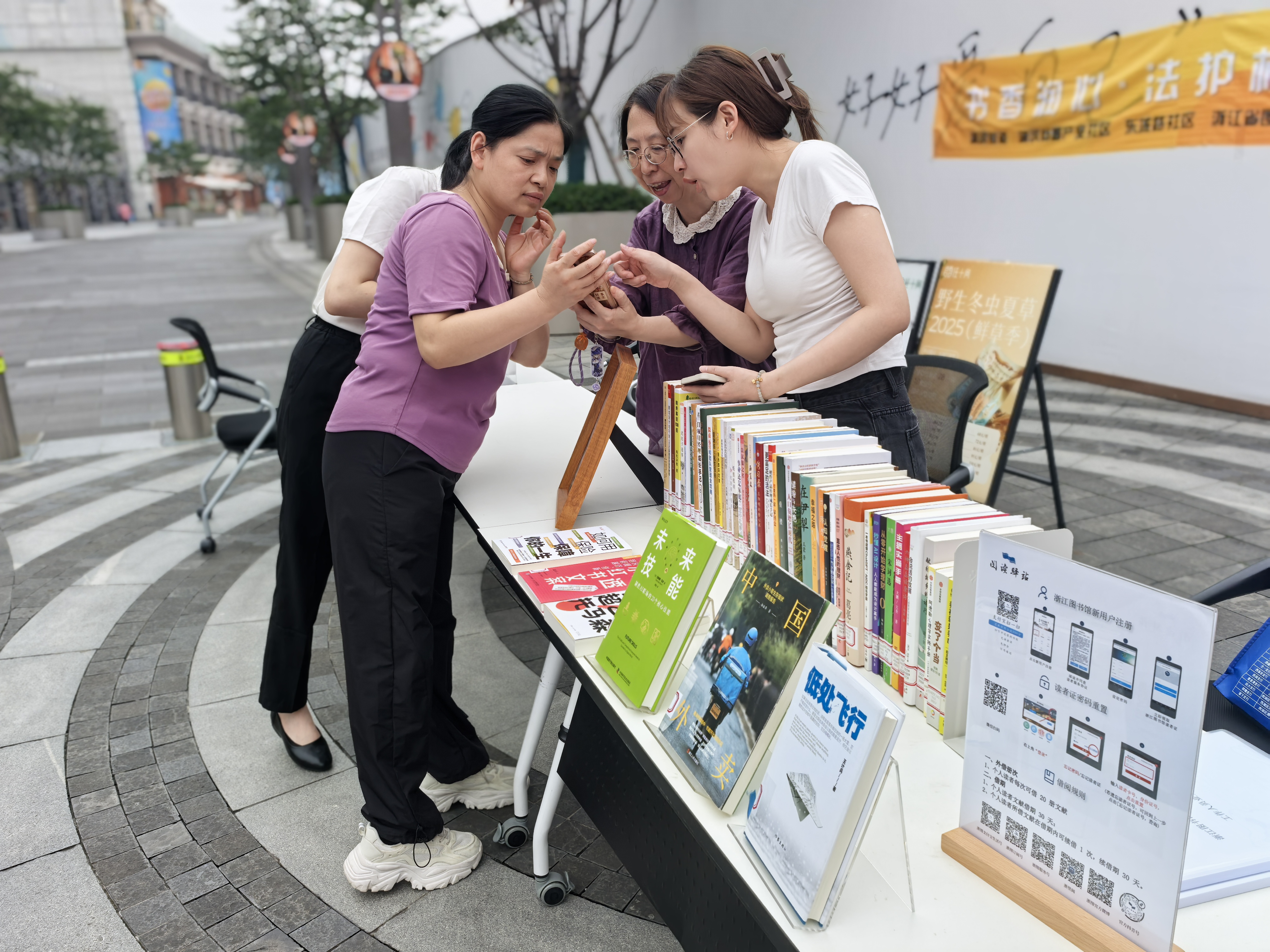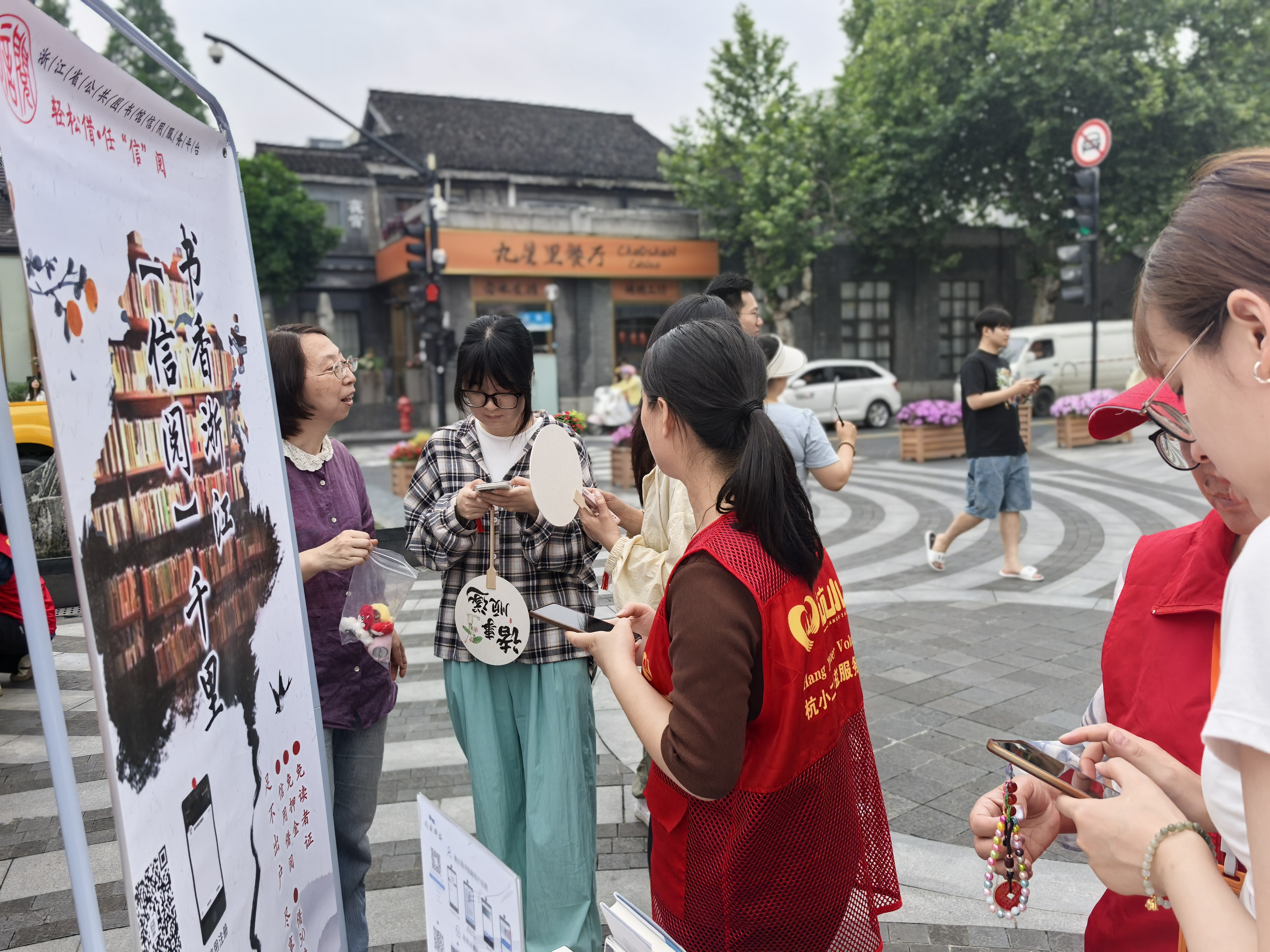 活动现场气氛热烈,吸引了300余人包括新就业群体、商圈商户、市民及游客的积极参与。浙江图书馆工作人员向现场读者全面展示了阅读驿站的便民服务功能,包括图书通借通还、数字资源共享、“信阅”服务等公共文化服务内容,为市民朋友们讲解示范如何更加便捷地享受图书馆的文献资源。此外,依托驿站丰富的图书资源,活动现场还摆出了“流动读书角”,旨在为市民们打造“身边的图书馆”,进一步丰富他们的精神文化生活,助力书香城市建设。