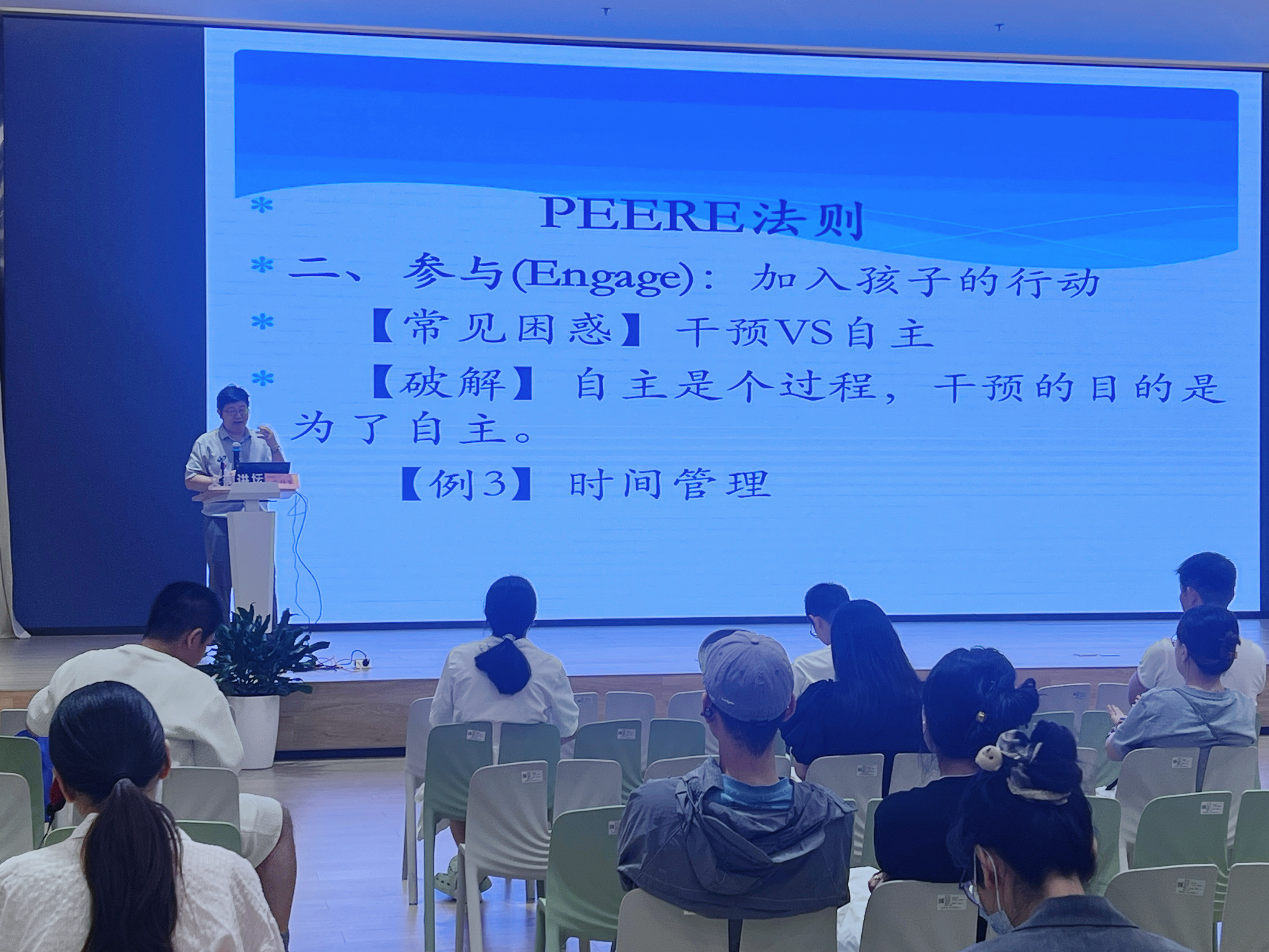 讲座中,庞老师分享了帮助读懂儿童的PEERE法则:以暂停(Pause)来看见孩子的需求,以参与(Engage)来加入孩子的行动,以鼓励(Encourage)来支持孩子的想法,以反馈(Reflect)来尊重孩子的选择,以衍生(Extend)来拓展孩子的视野。庞老师通过分享教学生涯中一个个真实、细腻的故事,结合PEERE法则,生动剖析了孩子们看似“无理取闹”、“沉默寡言”或“天马行空”背后的深层心理逻辑,为家长们育儿过程中常见的问题提供新的沟通和解决思路。