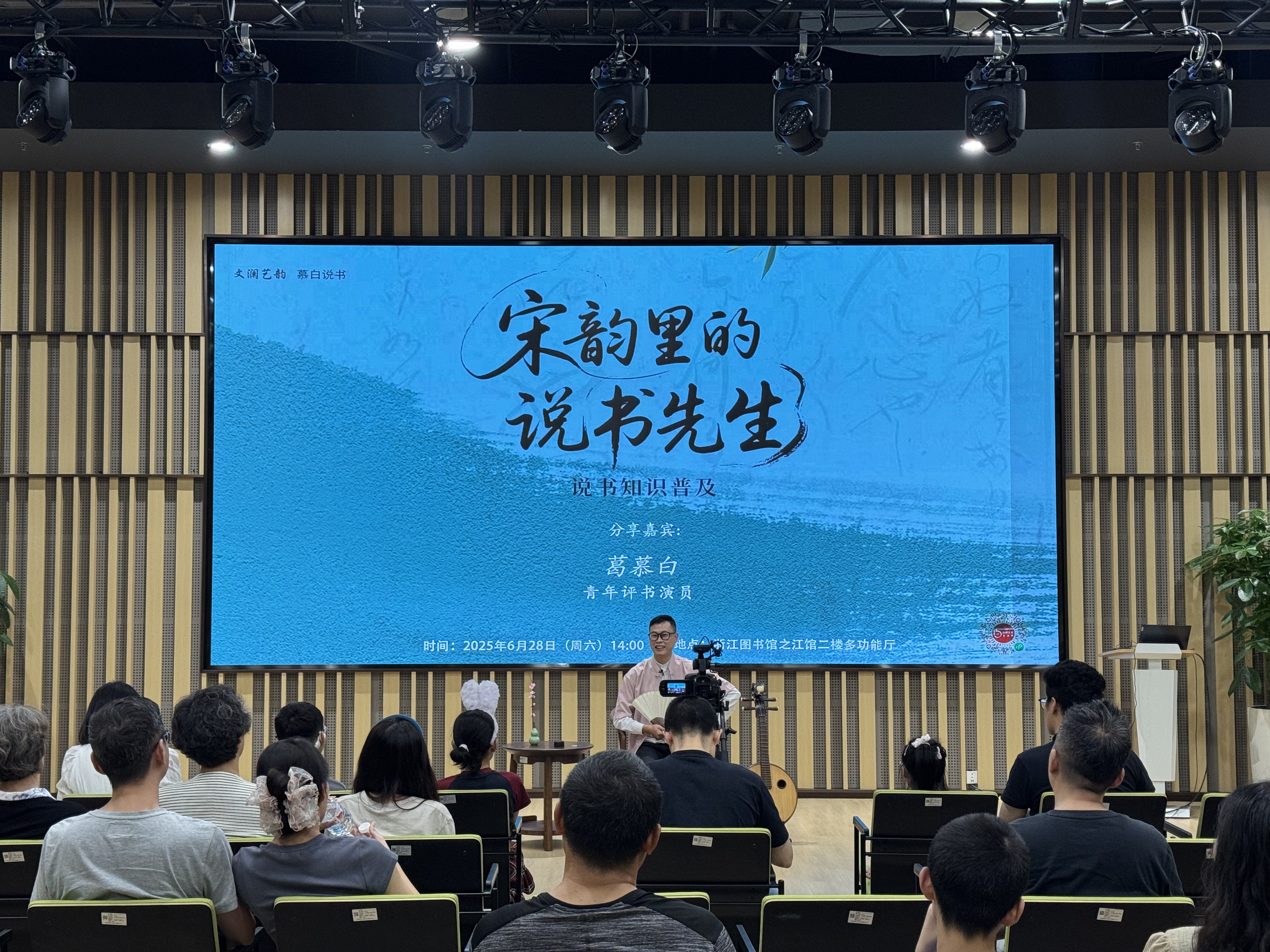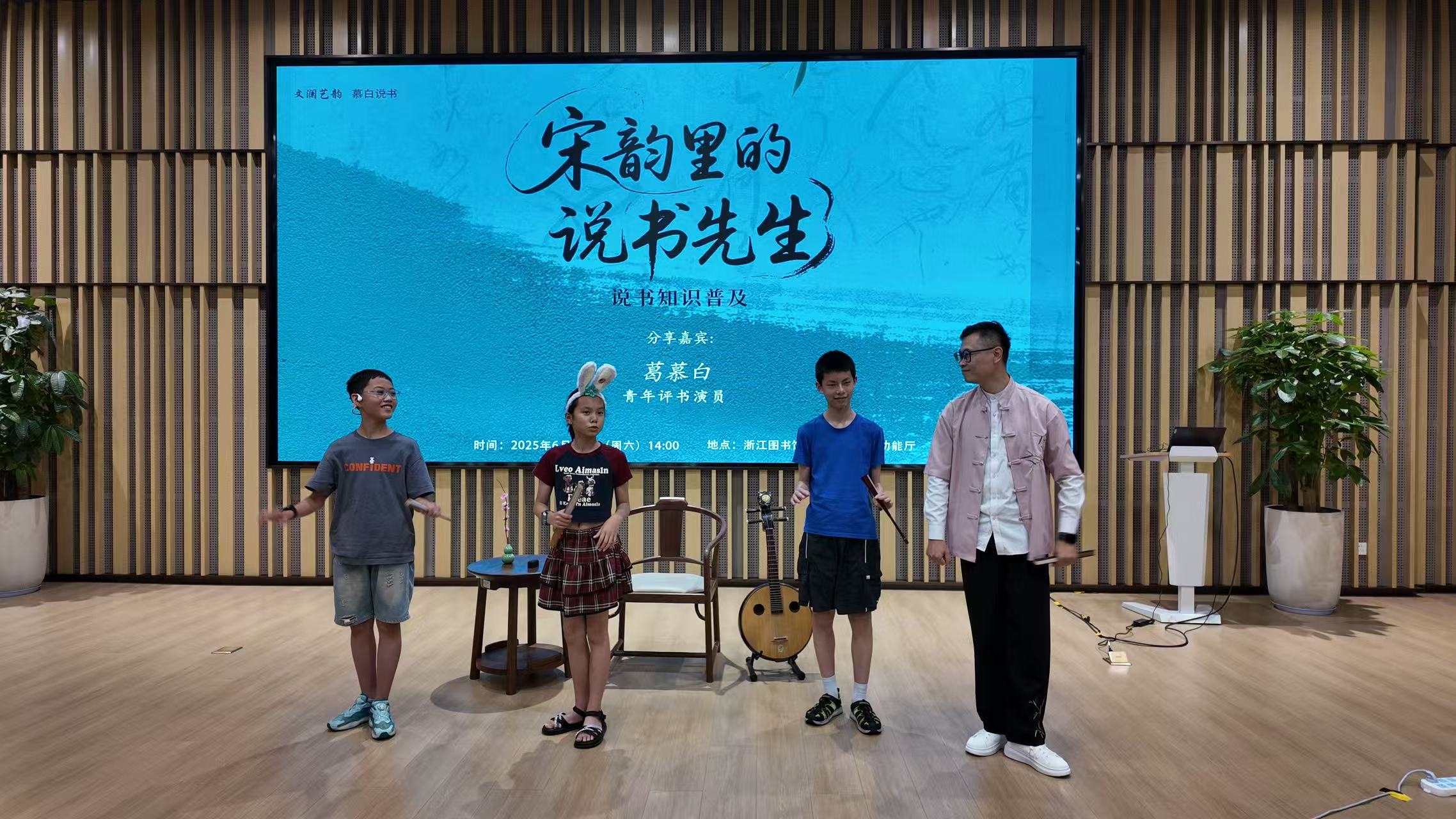2025年6月28日下午2点,浙江图书馆之江馆二楼多功能厅内一场以“宋韵里的说书先生”为主题的评书艺术体验活动在此精彩上演。活动特邀青年评书演员葛慕白老师以“脱口秀+沉浸式教学”的创新形式,带领读者穿越千年宋韵,感受传统曲艺的独特魅力。