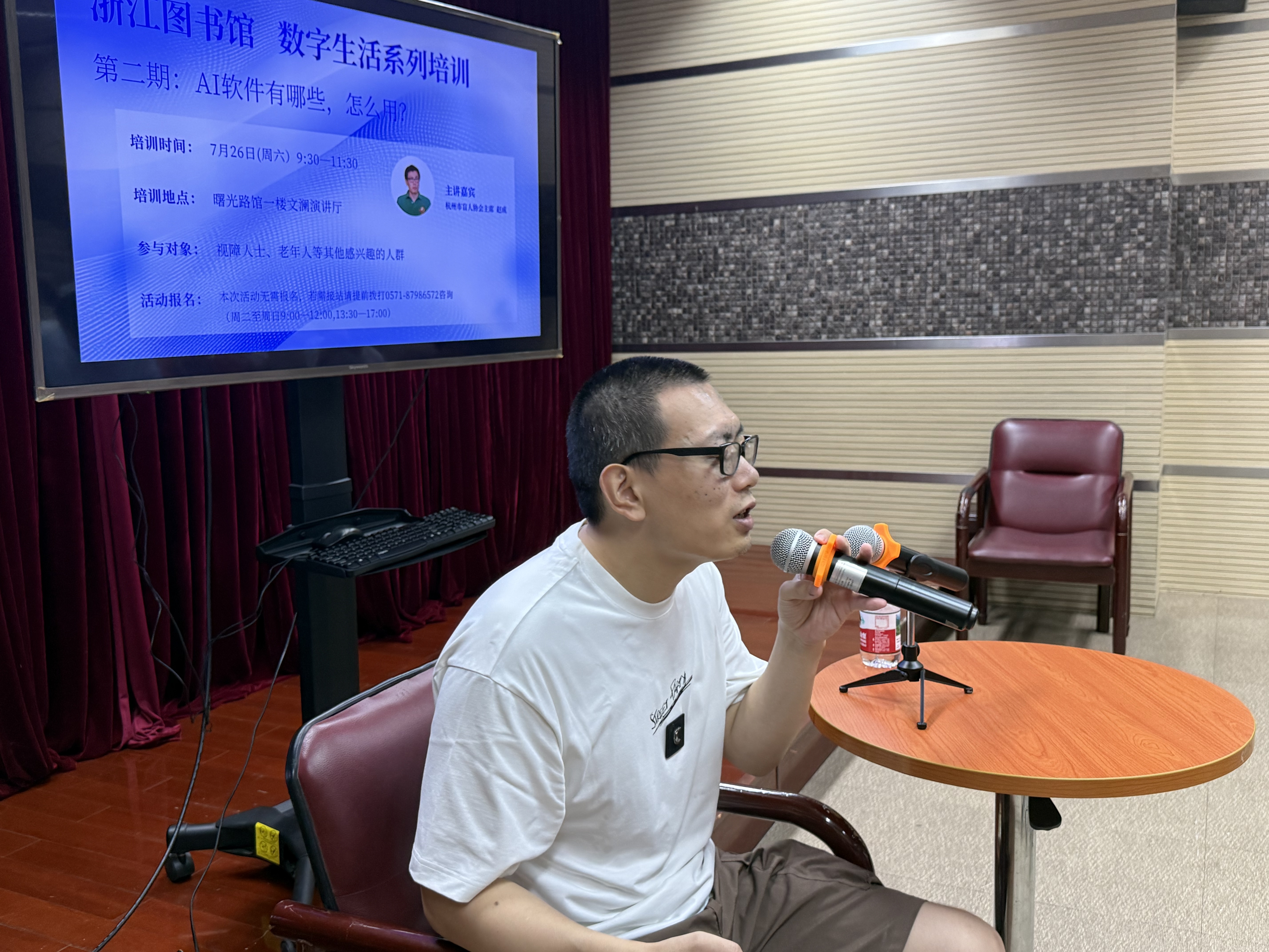 2025年7月26日,浙江图书馆数字生活系列培训第二期“AI软件有哪些 怎么用”在曙光馆成功举办。尽管当天早上大雨倾盆,仍有约40名视障读者和老年读者在浙江大学“有爱的”无障碍公益社团志愿者陪同下准时到场,共同开启这场AI助力生活的探索之旅。