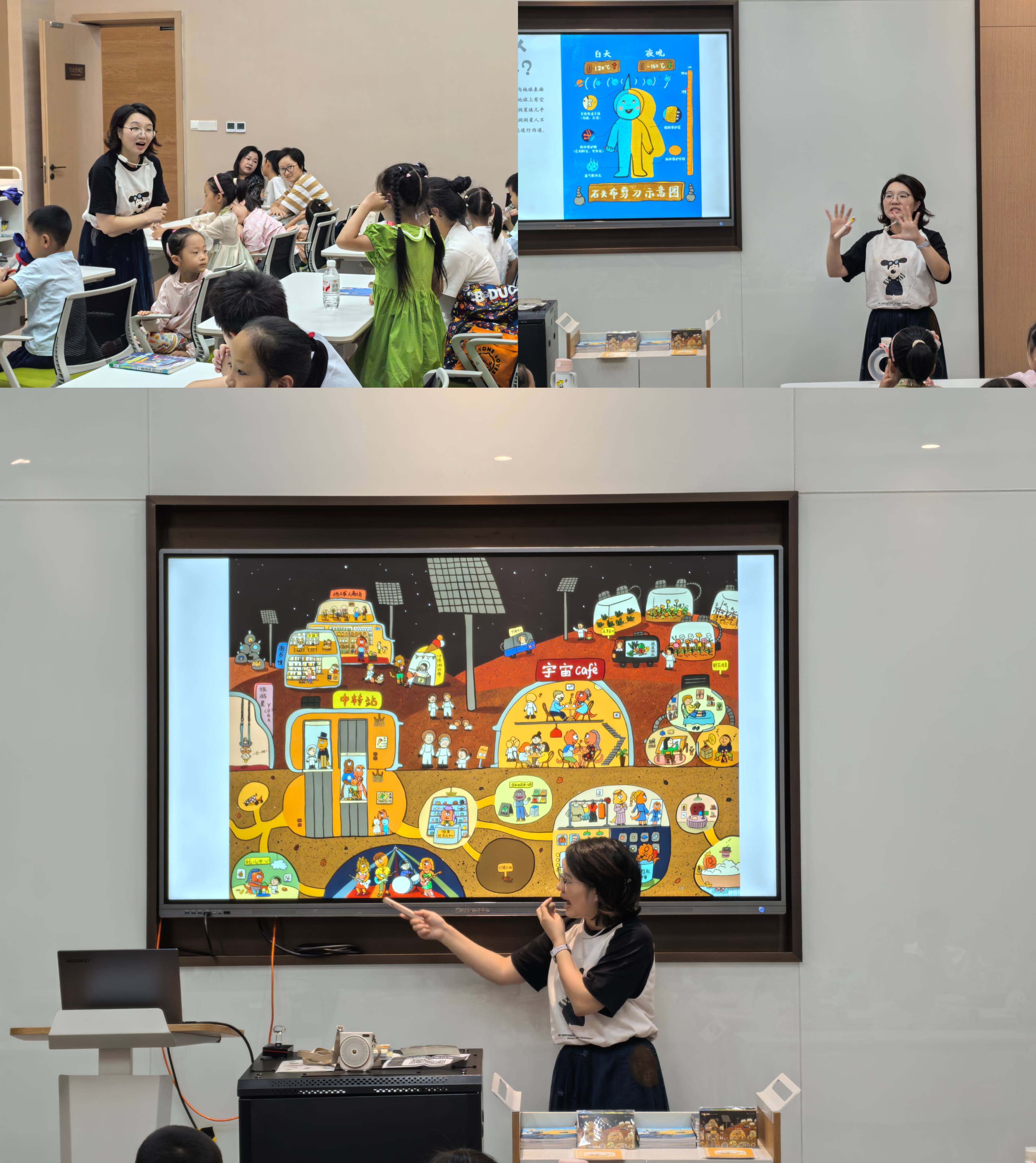 编辑老师配合着图书的文字和插图,逐一讲述每个星球的“别称”:月球被叫作“洞洞星球”,金星被叫作“黑金刚星球”,火星被叫作“旅游星球”,水星被叫作“飞毛腿星球”……将每个星球最显著的特点体现得淋漓尽致。而作者也依据这些特点,为不同星球的“居民”设计了不同风格的名字,自转轴倾角为98°的天王星居民,通常会使用“田”“口”这类躺着、立着都好读的字;离太阳最远、内部黑暗的海王星则会直接使用盲文。小读者在编辑老师的简单介绍后,也对太阳系的星球产生了初步的认识。