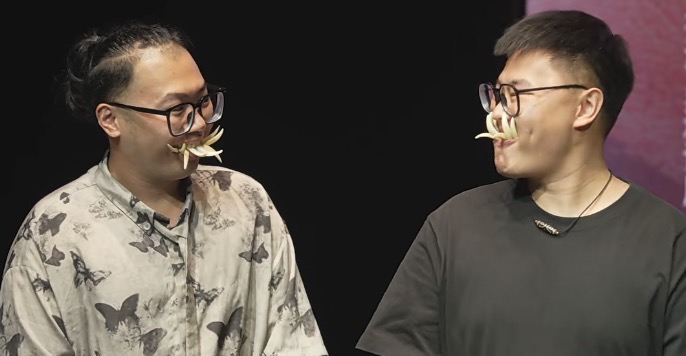 分享会中还邀请到了两位平调中心“耍牙”非遗传承人现场表演,他们在即将上演的《倚楼观戏》专场中分别饰演龙的九子鸱吻和五子狻猊,团队突破性地将这两种神兽形象转化为戏曲角色,将传统耍牙的 "咬、舔、吞、吐" 四式与神兽的性格特征深度结合,让它们以串场者身份贯穿元宵灯会、端午裹粽、重阳傩舞、冬至耍牙四个节气场景。这种创新不仅保留了神兽的文化寓意,更通过戏剧化处理赋予其叙事功能,成为展现宁海民俗的移动文化符号。