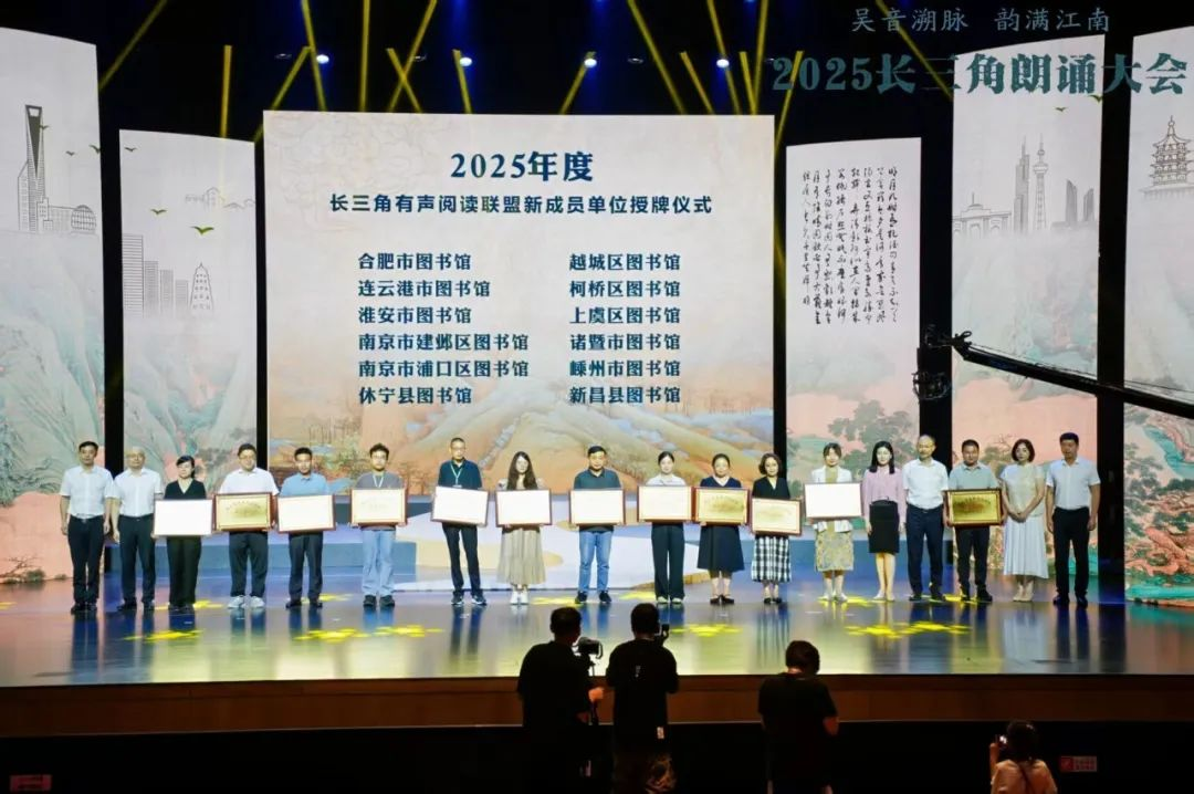 大会延续长三角有声阅读联盟的品牌传统,为江苏省南京市浦口区图书馆、南京市建邺区图书馆、连云港市图书馆、淮安市图书馆,安徽省合肥市图书馆、休宁县图书馆,及浙江省绍兴地区公共图书馆共计12家新成员单位授牌,并举办了2025年“天籁浙江 城市记忆”主题朗诵大赛总决赛的颁奖仪式。