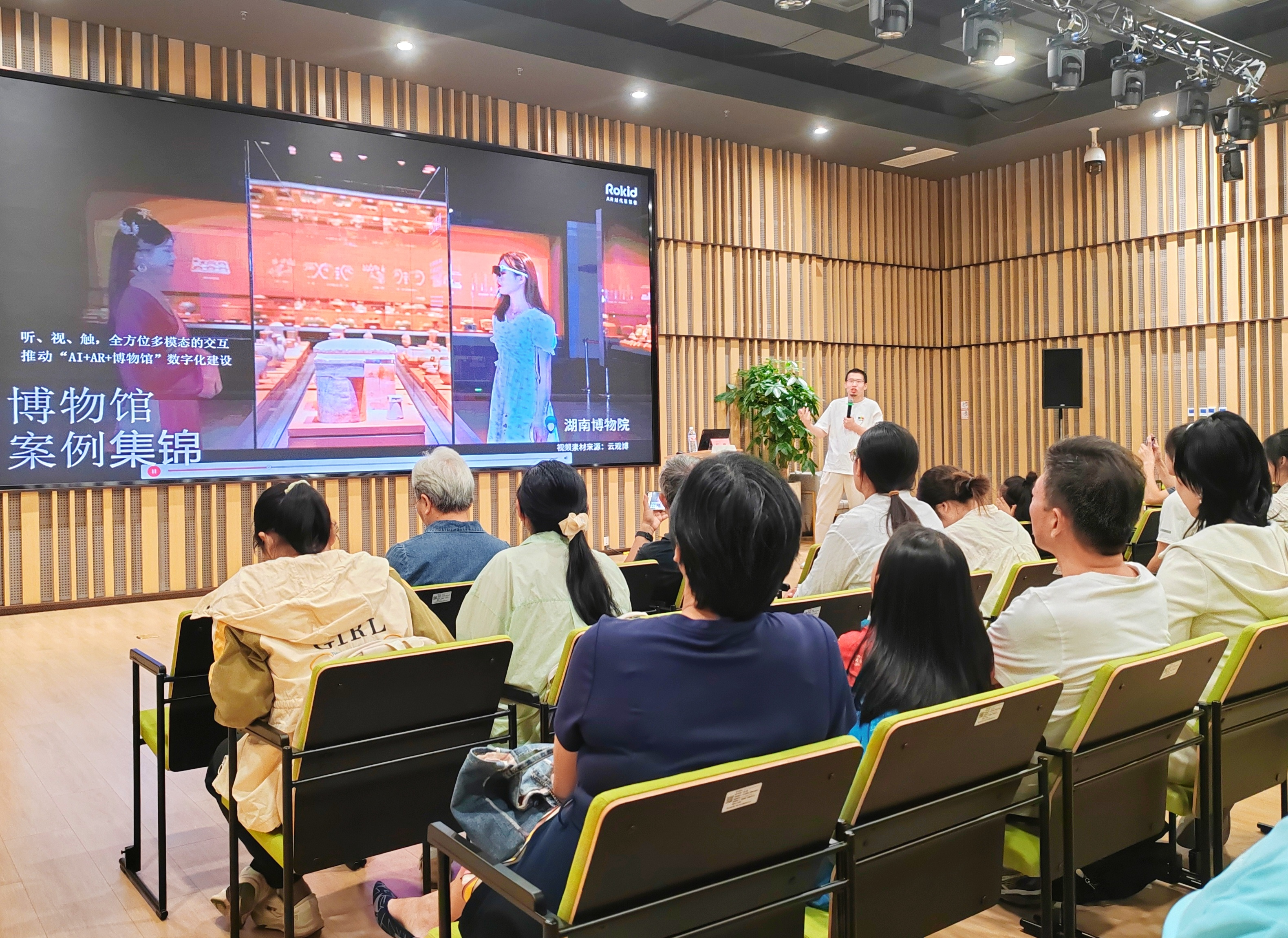 本次讲座特邀Rokid数字文化事业部浙江区业务总监高攀担任主讲嘉宾。作为AR领域的实践者,他以“AR赋能文旅沉浸式体验与文化空间新可能”为主题,生动阐释了AR技术如何重塑博物馆、古迹遗址等文化空间的叙事方式——将静态展陈转化为可感知、可互动、可共鸣的“故事现场”。他结合多个文旅行业实际案例,解析AR技术的落地路径与未来趋势,展现沉浸式体验如何重构公众与文化的连接。现场观众还通过Rokid智能眼镜亲身体验,推开时空“任意门”,提前触摸未来文旅的轮廓,感受虚拟与现实交融的奇妙场景。