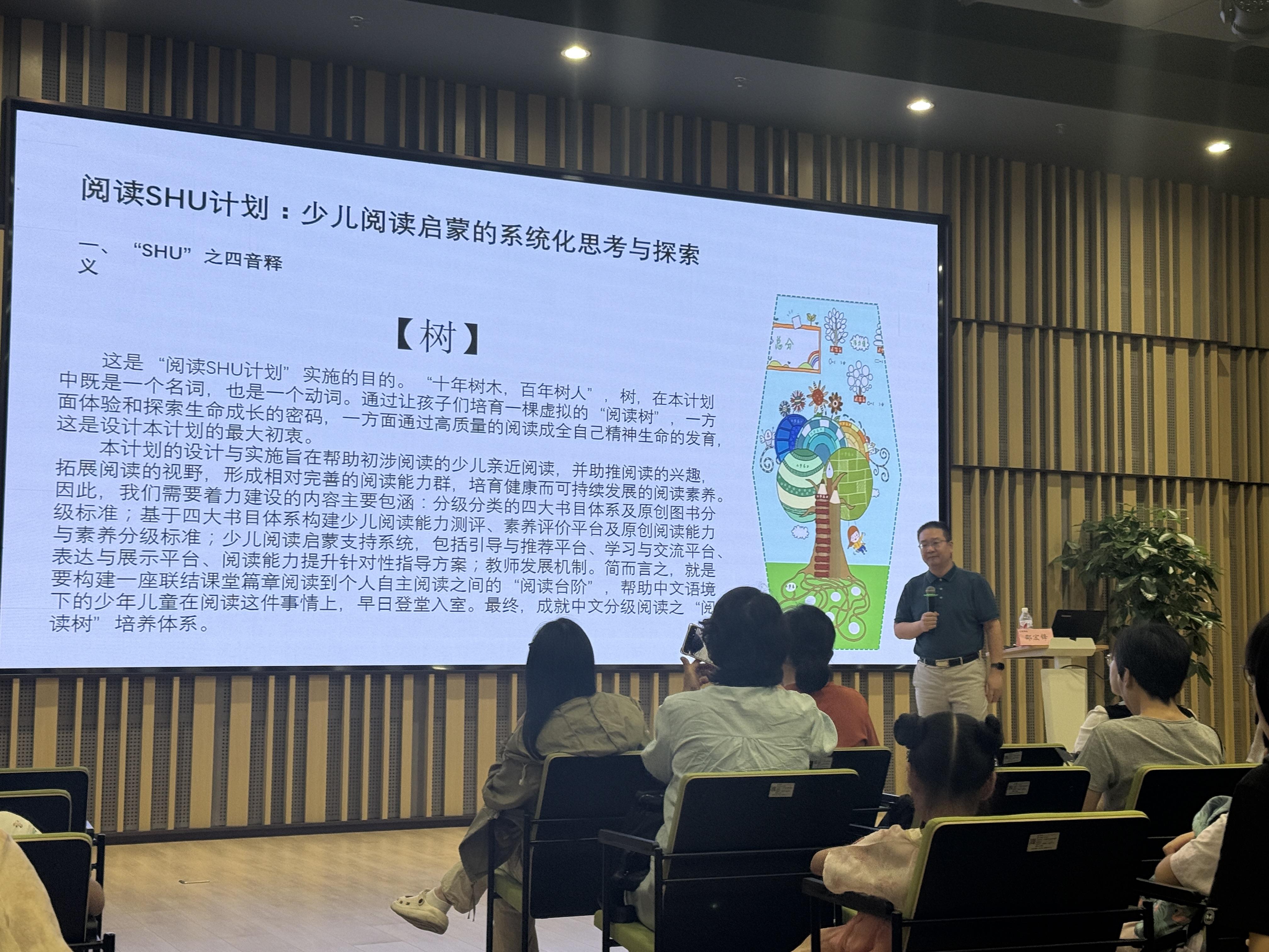 邵校长详细解读了如何通过阅读数量、质量等多维评价体系,将阅读成果转化为“活力值”,激励孩子培育属于自己的“阅读树”。他特别强调,该计划不仅是一套书目体系,更包含“SHU”的四大支撑维度:优质图书资源(书)、教师专业培训(塾)、数字技术赋能(数)和成长目标设定(树),通过系统化方案解决“读书少、读不透”的教育难题。