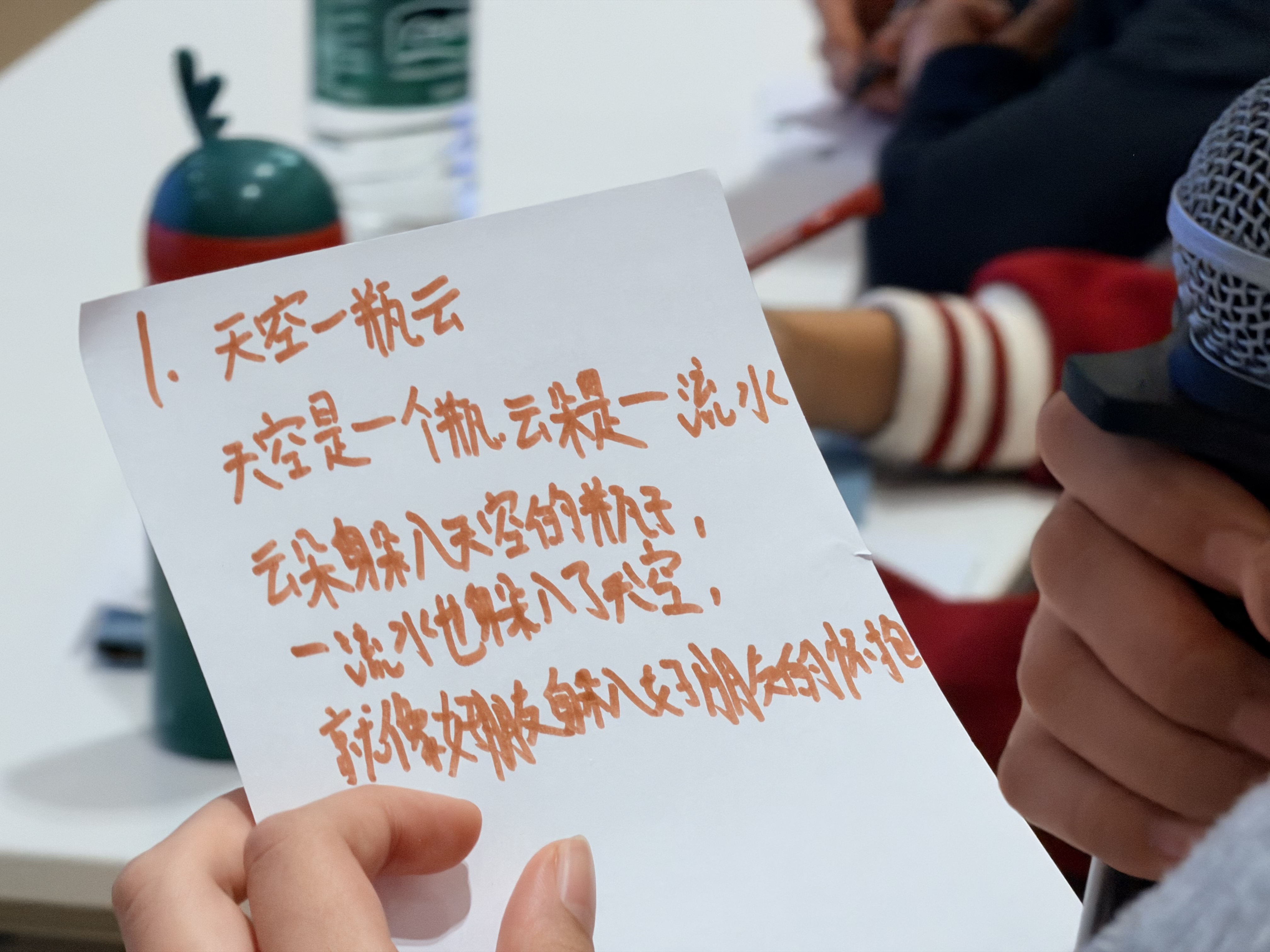 思想的闸门一旦打开,创意的水流便奔涌而出。在孔老师亲自示范下水诗作《一只云》后,孩子们拿出早已备好的“神笔”,开始了自己的创作。他们以独特的数量词为起点,将眼前的生活与心中的想象编织成诗行。现场只听见笔尖划过纸张的沙沙声,那是思维在跳舞的声音。