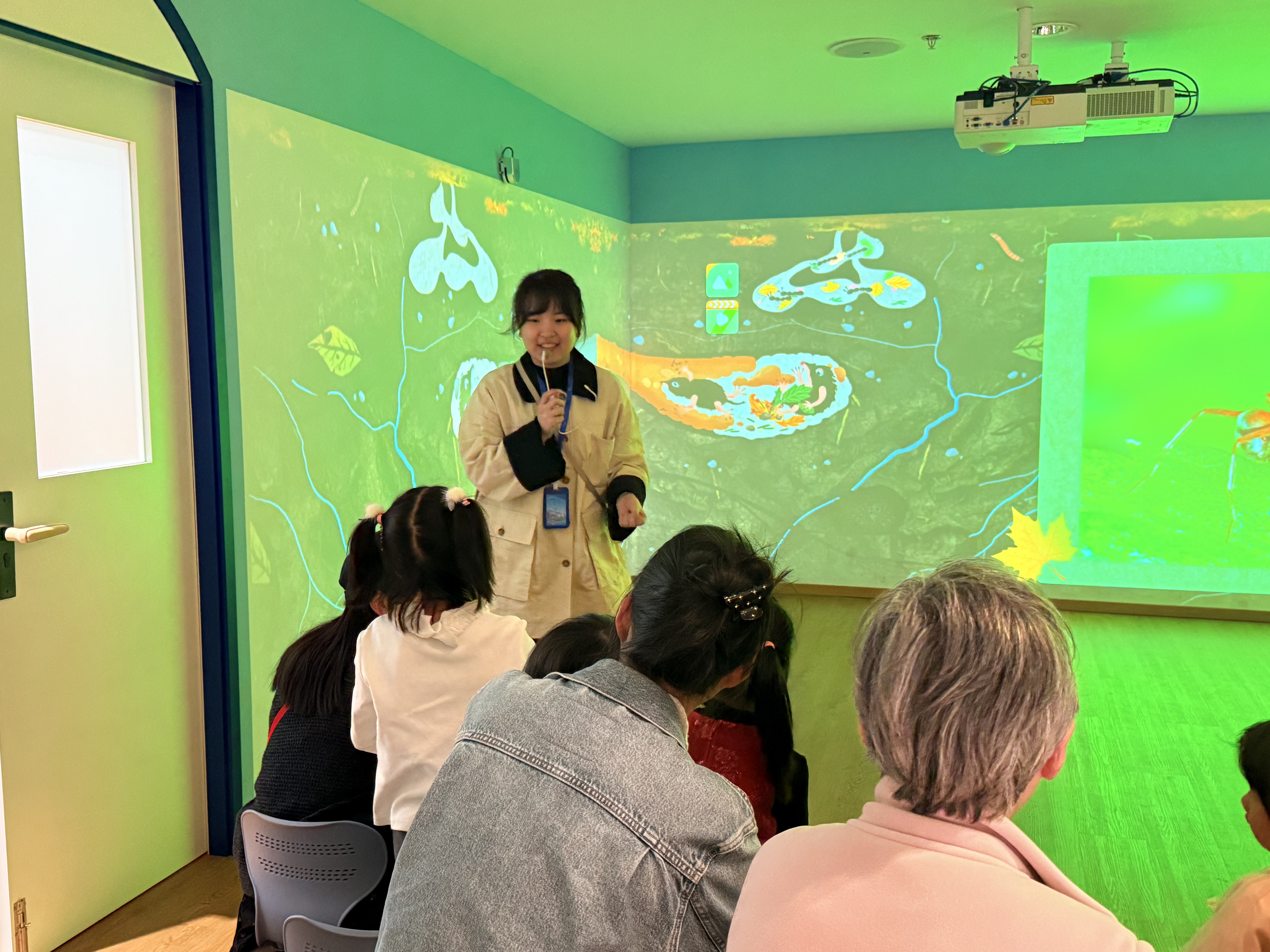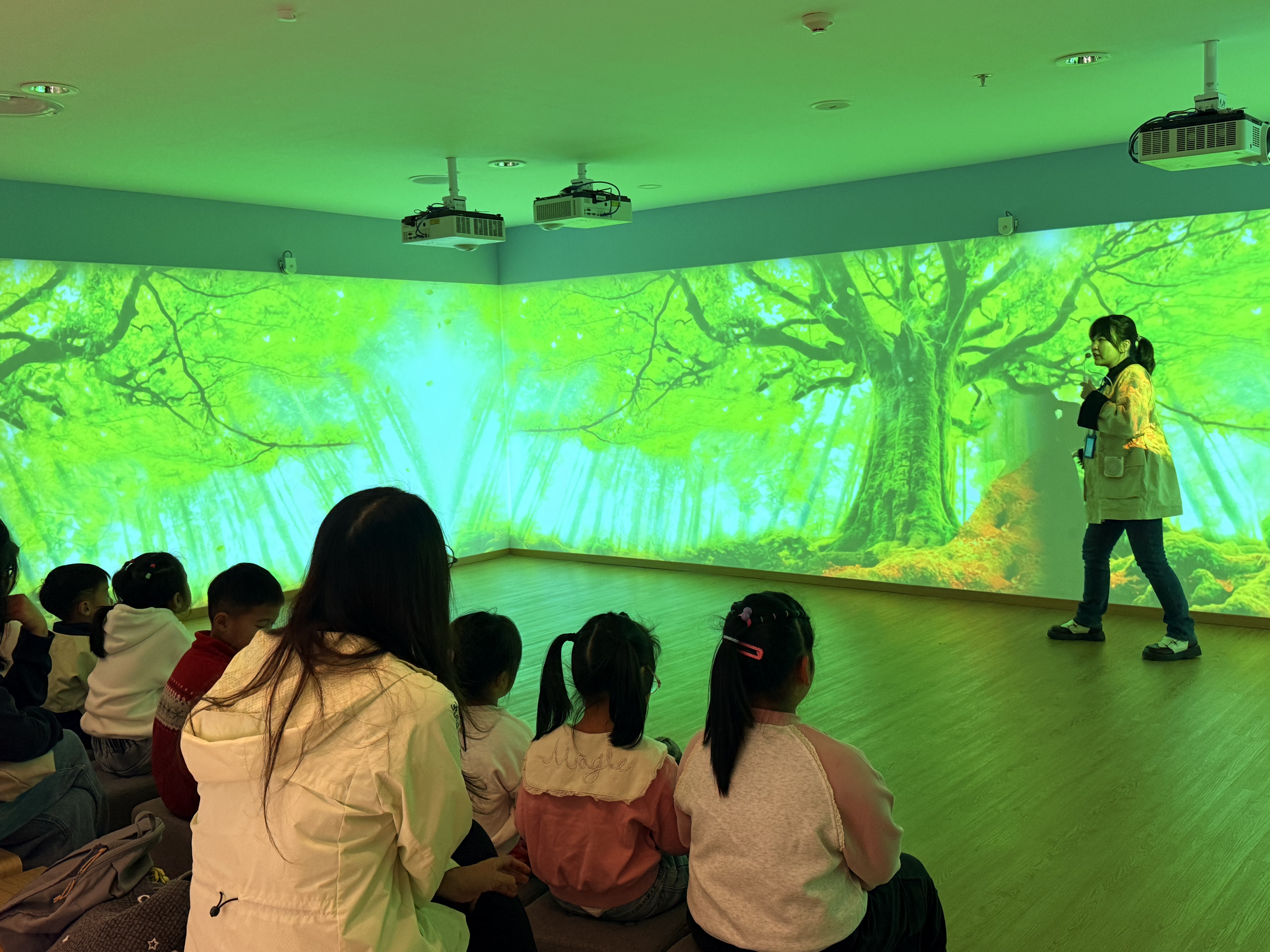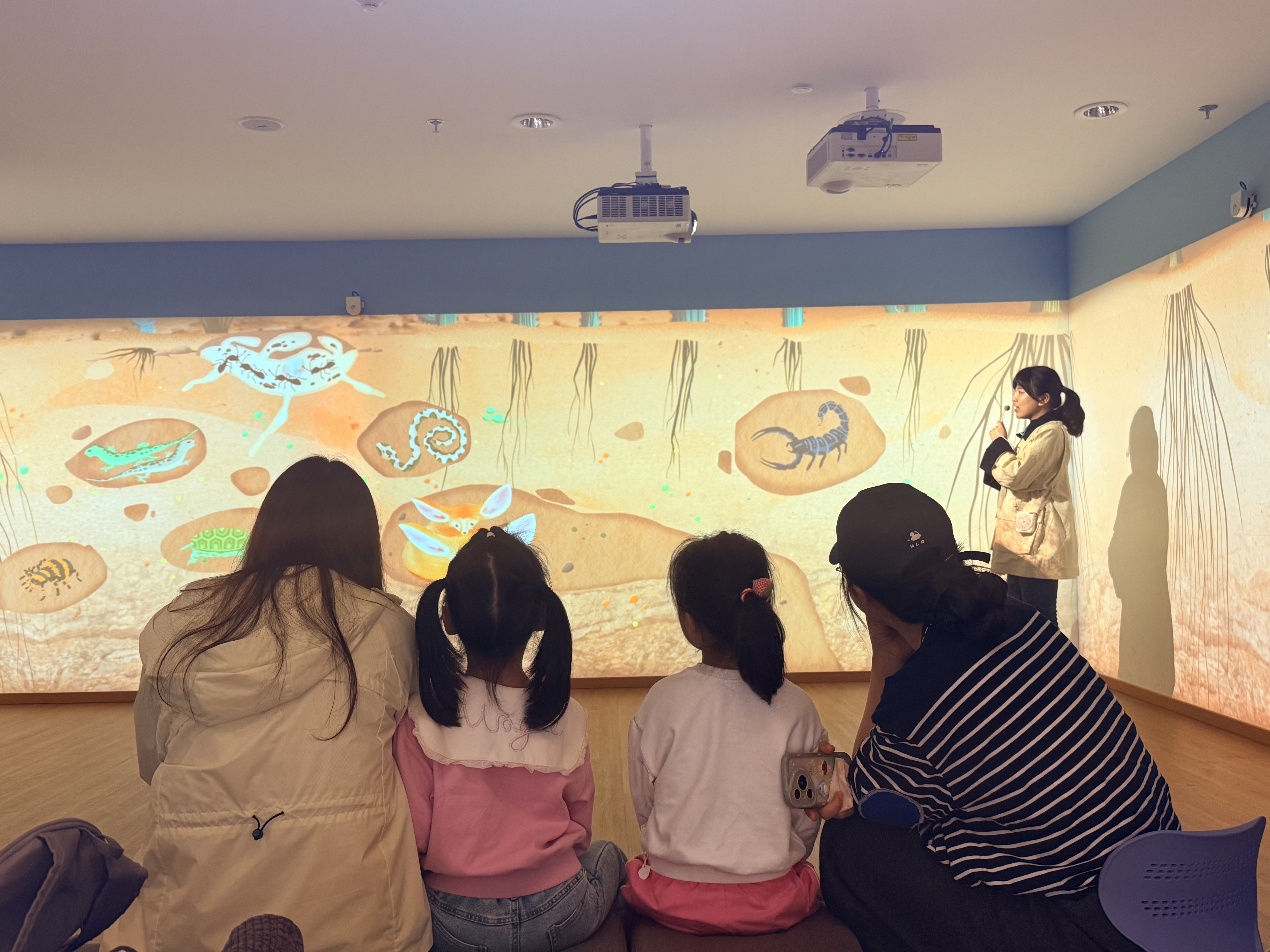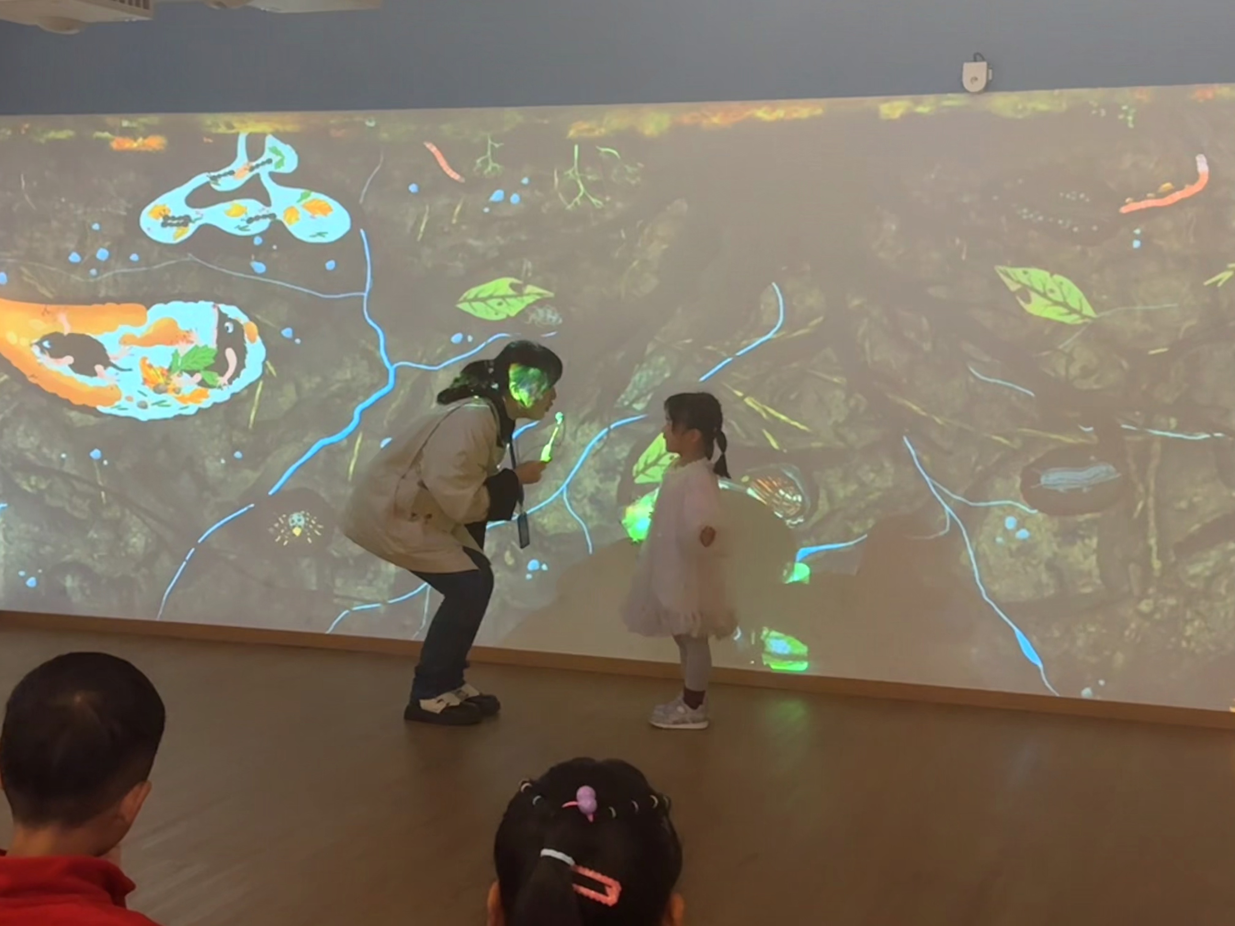 在光影技术营造的沉浸氛围中,三面环绕的巨幕缓缓展开了一幅生动的生态画卷。小读者们的目光跟随镜头,先后深入湿润幽静的森林土壤和广袤炽热的沙漠地带,直观感受着两种截然不同的自然环境所带来的震撼。平日里脚下最寻常的泥土,此刻正将其中孕育的无数奇妙生命呈现在我们眼前。