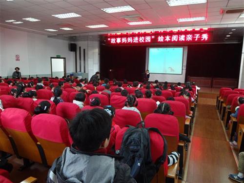 此次活动在一年级学生中开展,共表演了十一个故事。表演形式有三种:学生表演、学生和家长共同表演以及家长单独表演。故事在背景画面、音乐的配合下生动的述说着:讲述了一本本绘本悦读过程中带来的亲情、友情、历险探索经历等。如《我幸运的一天》、《小猪变形记》以情景剧形式真实展现故事场景,并揭示深刻的生活哲理。《猜猜我有多爱你》母女同台,穿着亲子装,头戴可爱的小兔耳,通过语言结合形体演绎了一场母女情深的关怀。台上孩子、家长投入地表演,引起台下的小观众不时传出欢快的笑声。