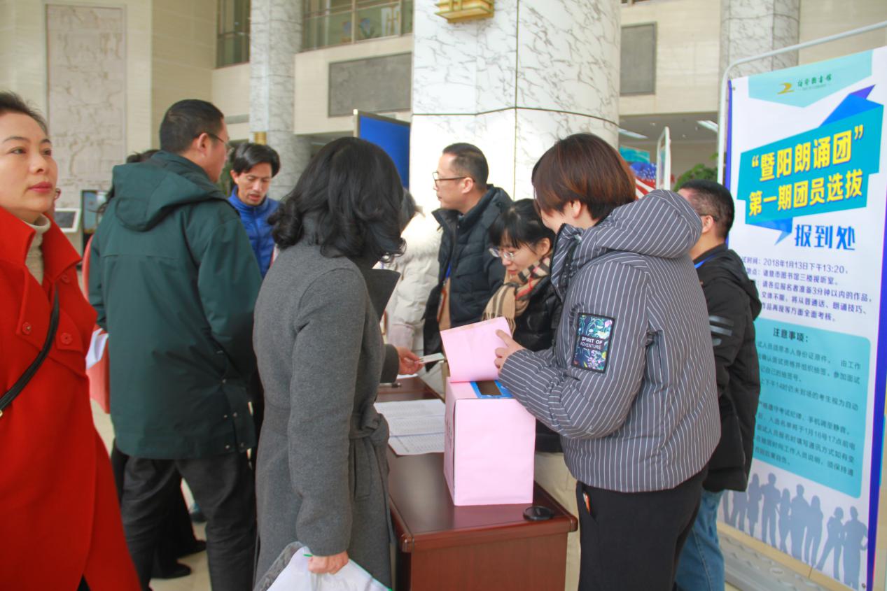 1月13日下午,“暨阳朗诵团”第一期团员选拔面试在诸暨市图书馆进行。本次招募得到了我市广大朗读爱好者们的热烈响应和积极参与,报名参加选拔的人员来自各行各业,既有从事播音、主持工作的广播电视专业人员,也有教师和大中小学生,还有公务员、公司职员和退休人员等朗读爱好者。选拔面试现场,各位面试人员或慷慨激昂或声情并茂,专家评委从普通话、朗诵技巧、作品再现等方面进行了全面考核。