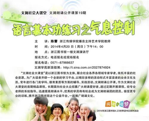 “文澜社会大课堂”是以浙江图书馆为主体,联合社会各界各领域专家学者,依托丰富的社会资源,为广大读者开辟一个全新的学习平台。以精彩多样的活动形式丰富读者的业余文化生活,常年进行各门类学科、德育素质等方面的辅导、实践活动。文澜朗诵公开课,作为文澜社会大课堂的首期精品课程,长期面向社会大众招募广大朗诵爱好者。通过定期开展课程,经专业老师的系统指导,迅速提高朗诵水平。优秀的学员将有机会成为文澜朗诵团的团员,接受更专业的训练,携手浙江图书馆这个公益平台,一起推广朗诵文化。
