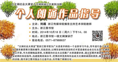 “文澜社会大课堂”是浙江图书馆为广大读者开辟的一个全新学习平台,常年进行各门类学科、德育素质等方面的辅导、实践活动,以精彩多样的活动形式丰富读者的业余文化生活。文澜朗诵公开课,作为首期精品课程,长期面向社会大众招募广大朗诵爱好者。通过定期开展课程,经专业老师的系统指导,迅速提高朗诵水平。优秀的学员将有机会成为文澜朗诵团的团员,接受更专业的训练,携手浙江图书馆这个公益平台,共同推广朗诵文化。