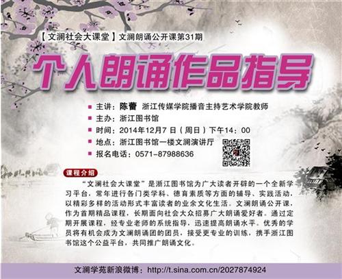 “文澜社会大课堂”是浙江图书馆为广大读者开辟的一个全新学习平台,常年进行各门类学科、德育素质等方面的辅导、实践活动,以精彩多样的活动形式丰富读者的业余文化生活。文澜朗诵公开课,作为首期精品课程,长期面向社会大众招募广大朗诵爱好者。通过定期开展课程,经专业老师的系统指导,迅速提高朗诵水平。优秀的学员将有机会成为文澜朗诵团的团员,接受更专业的训练,携手浙江图书馆这个公益平台,共同推广朗诵文化。