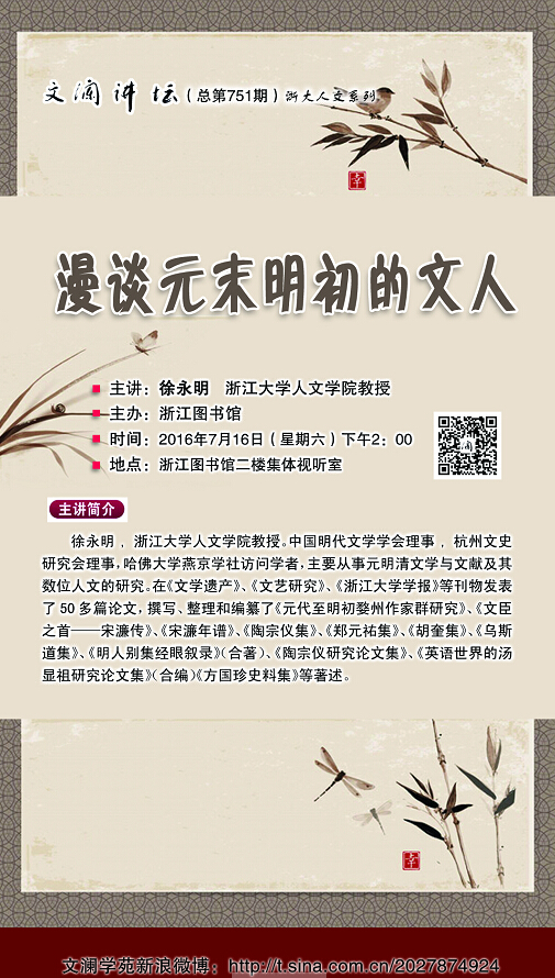 徐永明,浙江大学人文学院教授。中国明代文学学会理事,杭州文史研究会理事,哈佛大学燕京学社访问学者,主要从事元明清文学与文献及其数位人文的研究。在《文学遗产》、《文艺研究》、《浙江大学学报》等刊物发表了50多篇论文,撰写、整理和编纂了《元代至明初婺州作家群研究》、《文臣之首——宋濂传》、《宋濂年谱》、《陶宗仪集》、《郑元祐集》、《胡奎集》、《乌斯道集》、《明人别集经眼叙录》(合著)、《陶宗仪研究论文集》、《英语世界的汤显祖研究论文集》(合编)《方国珍史料集》等著述。