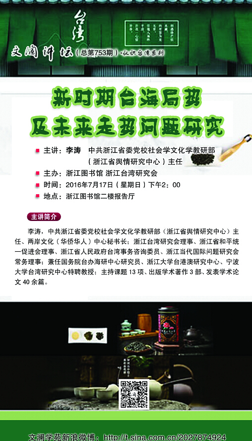 李涛,中共浙江省委党校社会学文化学教研部(浙江省舆情研究中心)主任、两岸文化(华侨华人)中心秘书长;浙江台湾研究会理事、浙江省和平统一促进会理事、浙江省人民政府台湾事务咨询委员、浙江当代国际问题研究会常务理事;兼任国务院台办海研中心研究员、浙江大学台港澳研究中心、宁波大学台湾研究中心特聘教授;主持课题13项、出版学术著作3部、发表学术论文40余篇。