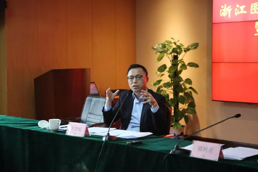 新一届理事会理事长井贤栋发表讲话,他感谢各位领导和理事对自己的信任,希望自己所致力的“普惠金融”事业能与图书馆的公益性价值相结合,通过商业推广、技术手段等方式能更好地与更多读者相连接,为进一步提升浙江图书馆服务水平和社会知名度尽一份心力。
