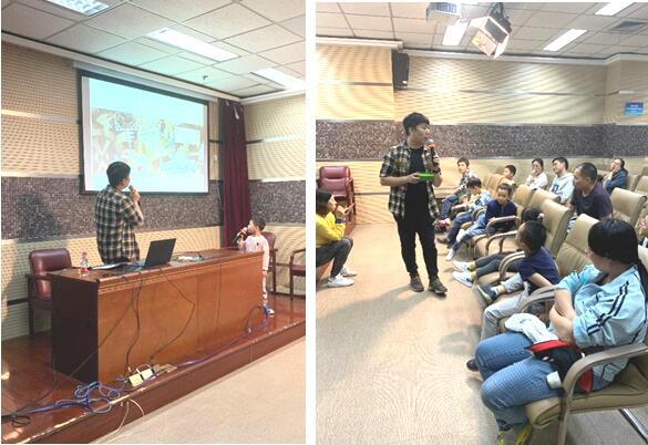 本次课程,小棋叔叔给小朋友们带来的是一个全新的绘本故事《机器人心里的蓝鸟》。为了契合这次活动的主题,在活动开始前,小棋叔叔向小朋友们推荐了电影《寻梦环游记》,并为小朋友们播放了一段。活动正式开始后,小棋叔叔首先与小朋友们进行暖场互动。他简单地介绍了自己,并邀请了一位小朋友上台介绍自己。在这一环节中,小棋叔叔教孩子们如何礼貌地邀请别人、得体地介绍自己,然后就正式切入主题——绘本故事《机器人心里的蓝鸟》。