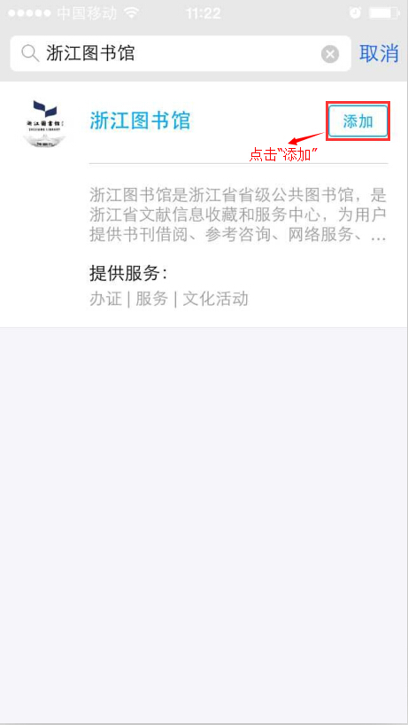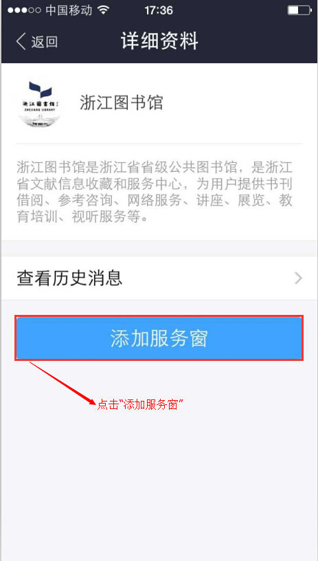 ,点击“服务窗”,搜索“浙江图书馆”,点击“添加”即可。