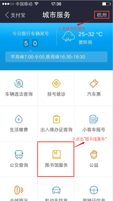 ,点击“城市服务”-选择“杭州”-点击“图书馆服务”,点击“添加”即可。