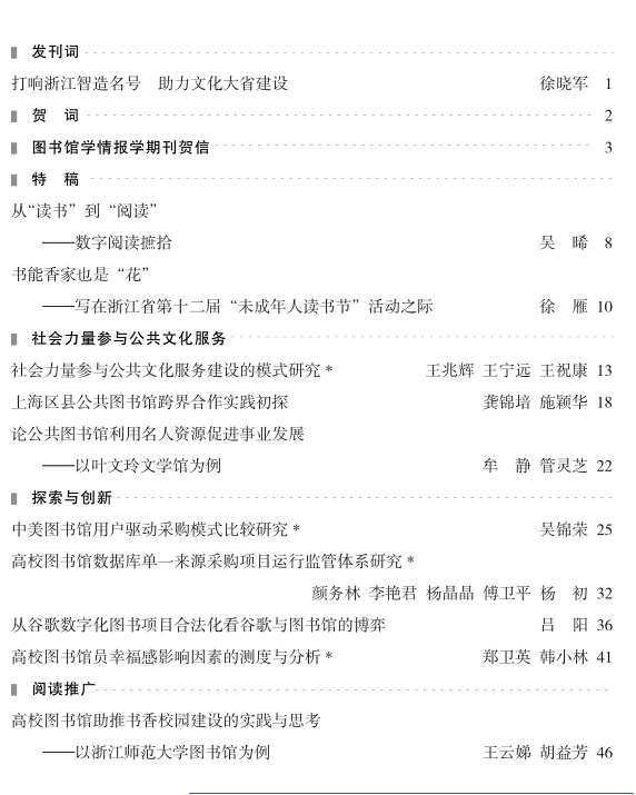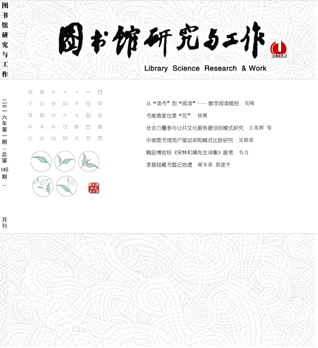 如今,面对以移动互联为代表的新技术浪潮对传统图书馆业务的全方位冲击,面对微信、微博、客户端等新媒体平台所带来的碎片化阅读风潮对读者的争夺,面对知识爆炸、信息过剩时代读者对图书馆精准有效服务的更高要求,图书馆学研究面临着许许多多的新课题、新挑战。在国家和省新闻出版管理部门及省文化厅的关心和支持下,由浙江图书馆主办的《图书馆研究与工作》终于获批公开刊号并如期发行,从而为浙江现代图书馆和图书馆学建设提供了更广的视野和更大的平台,必将带来对全省图书馆事业转型升级的巨大智力支持。