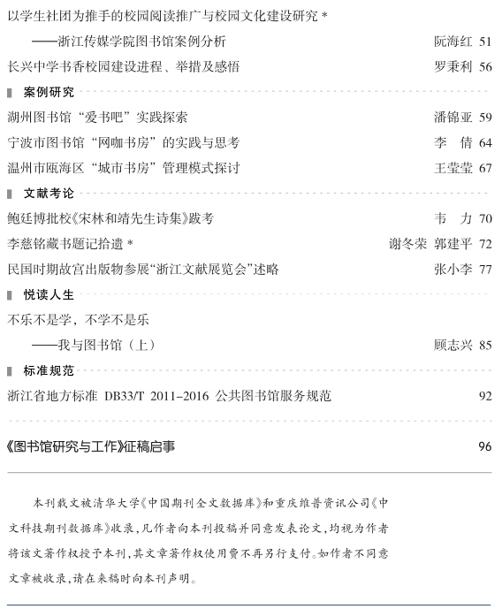改革开放以来,省委、省政府积极实施文化大省战略,使浙江图书馆事业得到快速发展——新馆建设方兴未艾,文献资源大幅增长,现代技术广泛应用,服务水平全面提升,多项工作走在全国前列。《图书馆研究与工作》(内刊)正是在这样的时代大背景下担负起促进浙江图书馆学研究与发展的重任。该刊坚持“学术研究与经验交流相结合、普及与提高相结合”的办刊方针,密切关注本省、全国乃至世界图书馆事业发展中的研究热点和前沿课题,努力贴近基层图书馆从业人员的业务需求,大力阐扬典藏宏富的浙江古籍和地方文献,逐步成长为助推图书馆界理论研究、经验交流、实践创新的不可或缺的重要平台。办刊35年来,该刊积累起一大批忠实的读者和高水准的作者,刊物质量得到新闻出版管理部门和业内专家的充分肯定,获得第七届全国图书馆学表彰期刊奖,刊物先后被中文科技期刊数据库、中国学术期刊网全文收录。