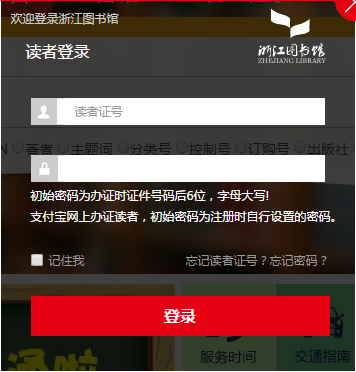 注:初始密码为办证时证件号码后6位,字母大写!支付宝网上办证读者,初始密码为注册时自行设置的密码。