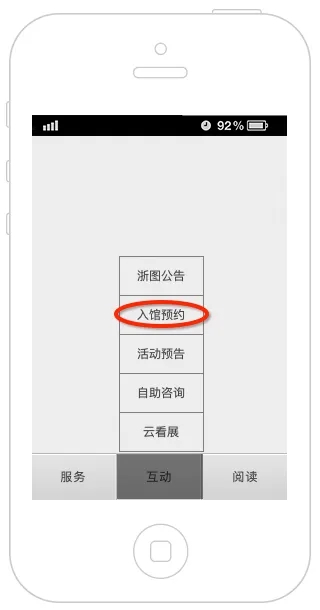STEP1:关注“浙江图书馆”微信服务号(公众号名称:zhejianglib),点击底部菜单栏“互动-入馆预约”进行预约。