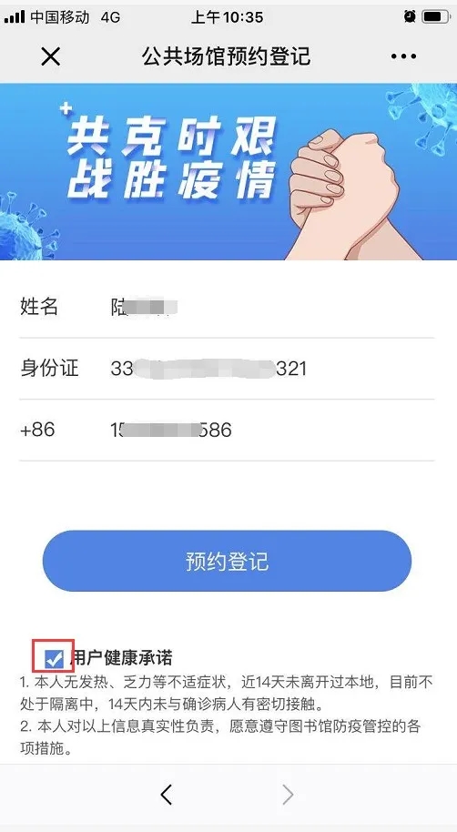 如实填写您的个人信息,勾选用户健康承诺,点击预约登记